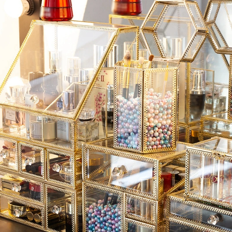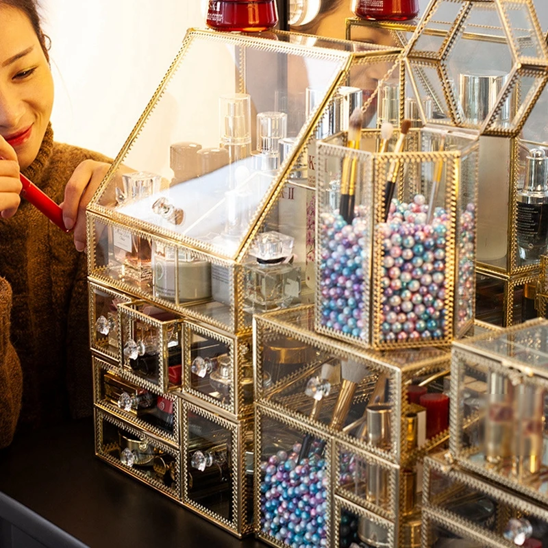 .Images of Transparent Drawer Makeup Organizer Glass Desktop finishing Skin Care Shelf Tissue Jewellery Necklace Ring Storage Box